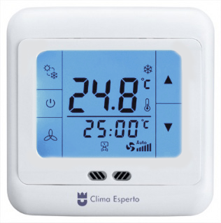Функции: вкл./выкл., регулятор скорости вентилятора в автоматическом или ручном режиме, управление 3-х ходовым клапаном, термостат, режим охлаждение-обогрев.